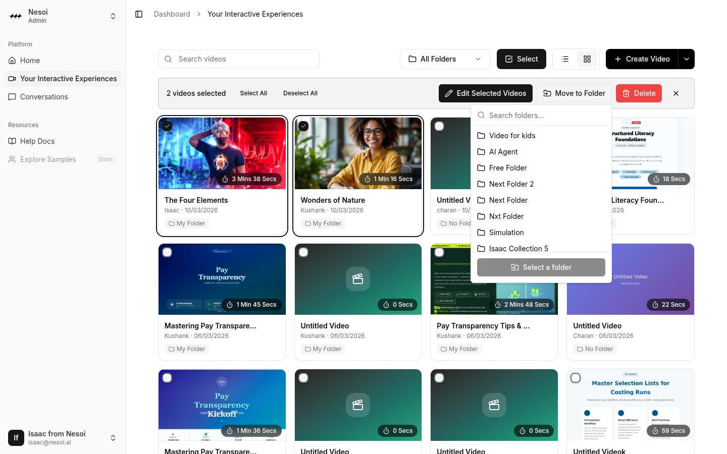 - Bulk — Select multiple videos and use the Move to Folder bulk action (see below)
