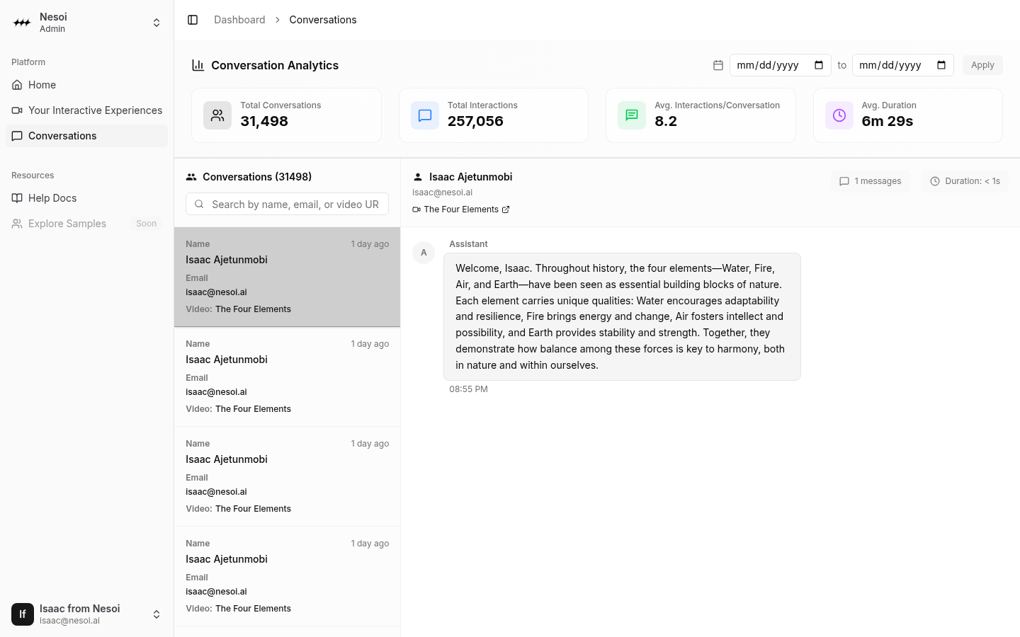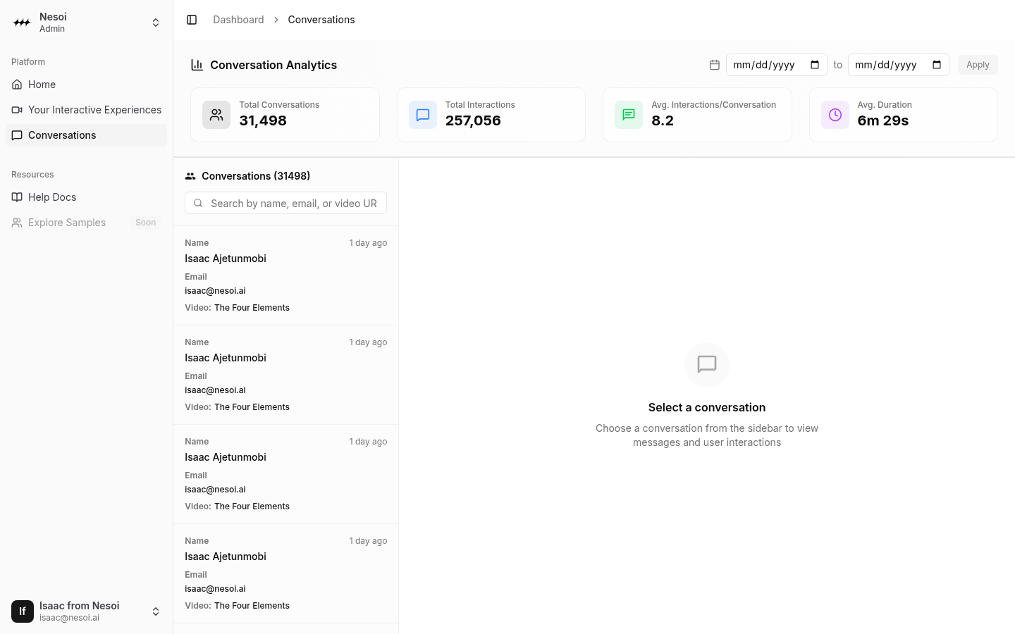 The Conversations page shows all viewer interactions with your AI across every video. Use it to understand what viewers are asking, how the AI is responding, and identify areas for improvement.