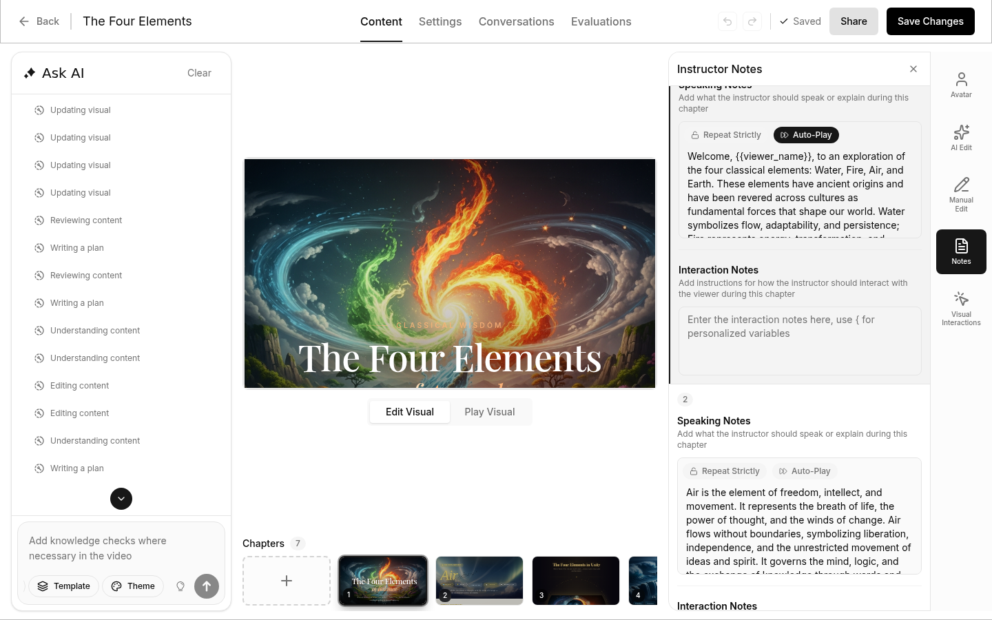 The Instructor Notes panel lets you control what the AI avatar says during each chapter and how it should interact with viewers. This is where you write the script and set interaction behaviors for each part of your video.