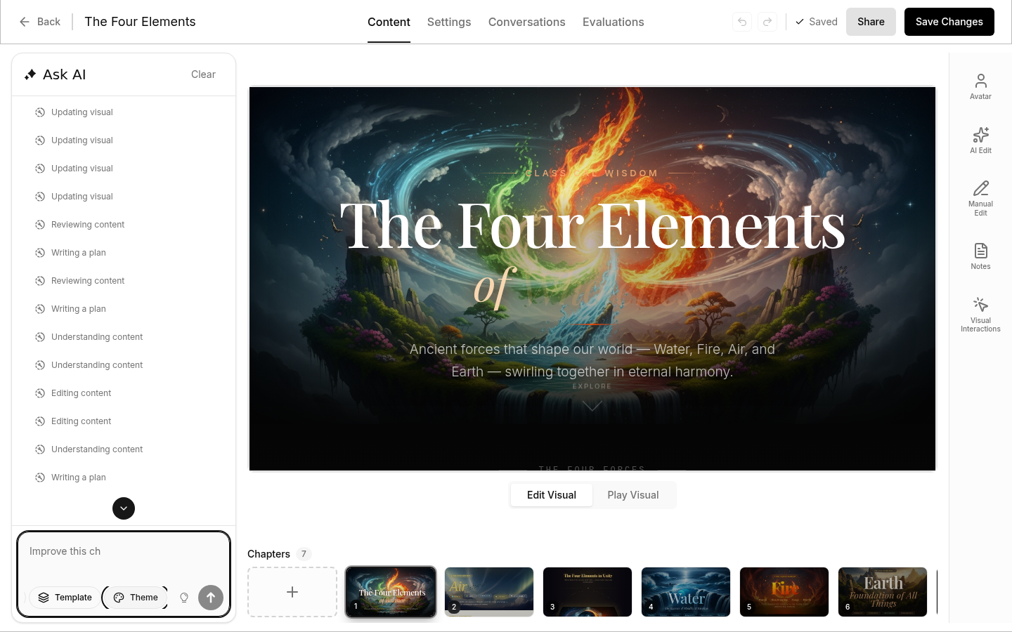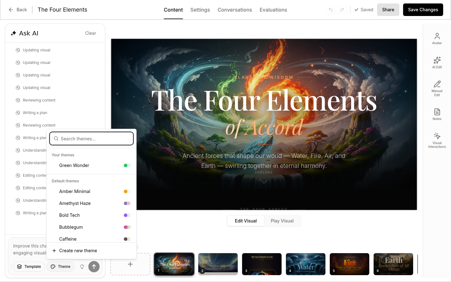 Templates and Themes control the visual appearance of your interactive videos. Templates provide comprehensive design systems that guide the AI when creating visuals, while Themes define colors, fonts, and basic styling.